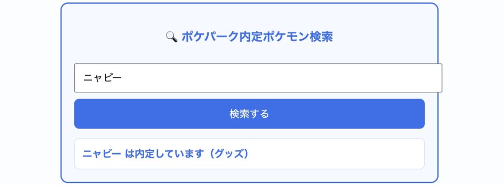 検索窓にポケモンの名前を入力することによって、そのポケモンがポケパークに内定しているかどうか知ることができます。またそのポケモンが何で内定したのか(紹介映像で映ったのか、グッズに書かれていたのか、など)を知ることができます。