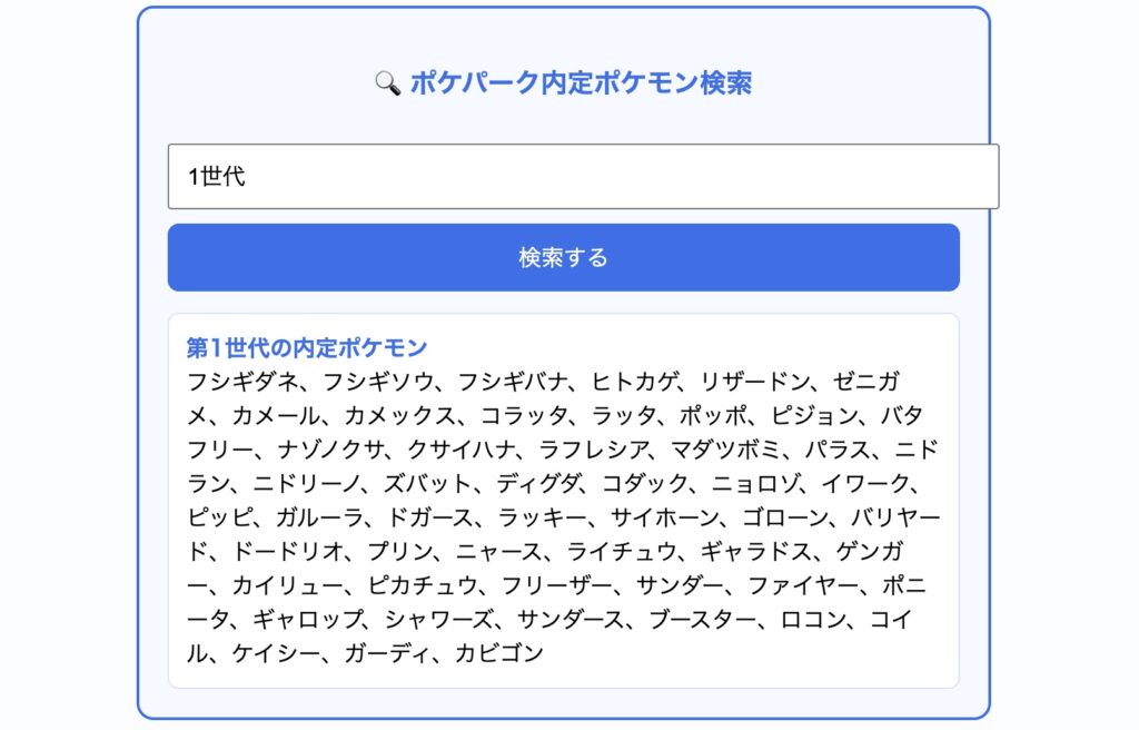 検索窓に「○世代」(○には半角で数字を入力)と入れて検索することで、その世代の内定ポケモンを知ることができます。成功した場合は以下の画像のようになります。