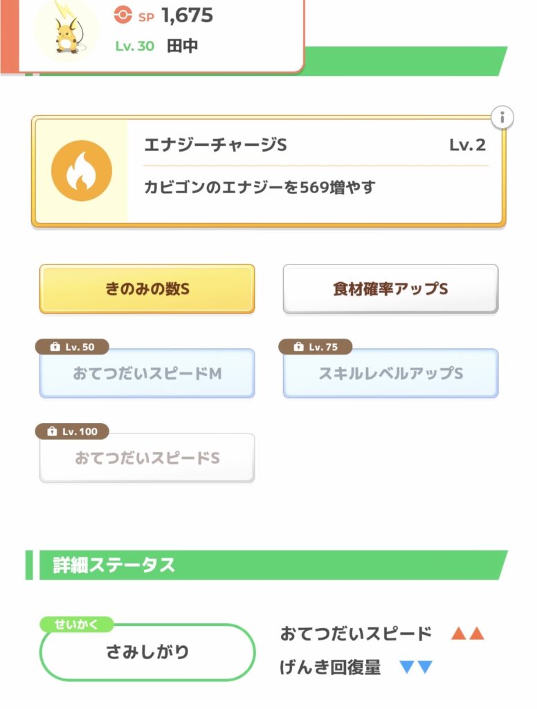 きのみSとはポケモンがきのみを持ってきやすくなる能力です。ピカチュウは木の実をたくさん持ってくる「きのみタイプ」のポケモンなので相性抜群です!!