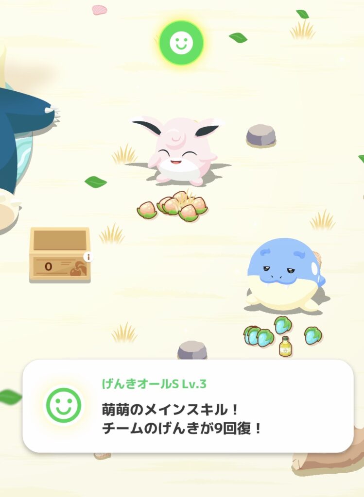 チームの元気を回復してくれる能力を使います。ポケモンは寝ないと元気がどんどん減っていって、効率が落ちるのでオススメです。